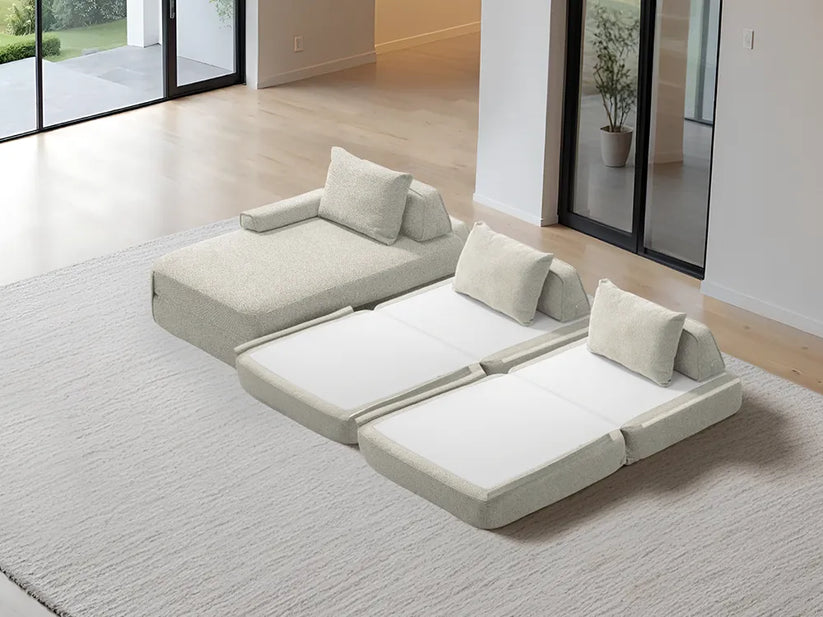 Cushie Modular Sofa Bed transforms from a stylish seat to a cozy bed in seconds—just flip and snooze. Unlike traditional sleeper sofas with noisy metal frames and complex pull-outs, Cushie keeps it simple and silent.