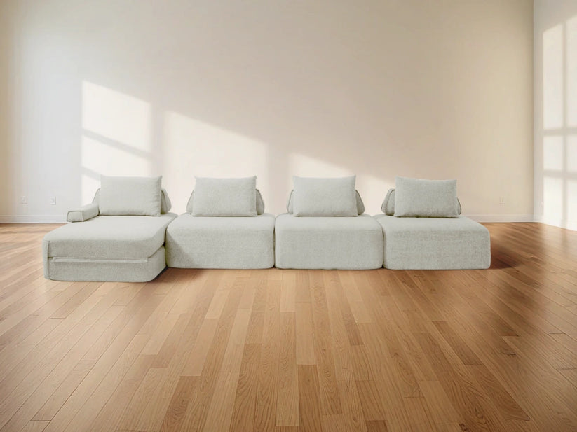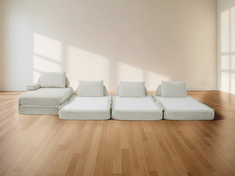 Cushie Modular Sofa Bed transforms from a stylish seat to a cozy bed in seconds—just flip and snooze. Unlike traditional sleeper sofas with noisy metal frames and complex pull-outs, Cushie keeps it simple and silent.