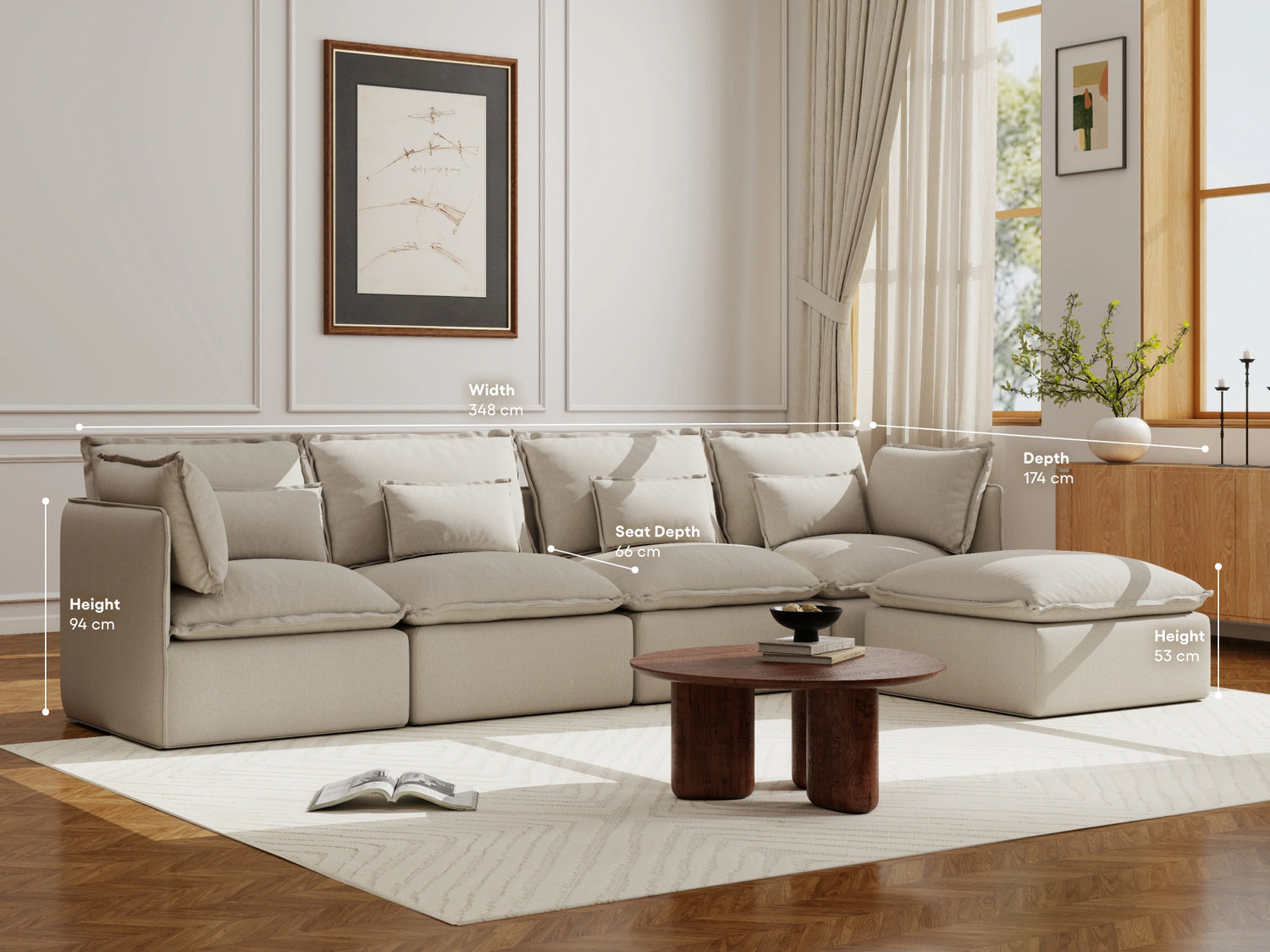 I originally got the 4 seater, I’ve since added two more seats and 2 ottomans. I have 2 toddlers and a dog (and a tradie) AND the white version and I am super impressed with the way it spot cleans. I’ve gotten pen, raspberry and chocolate off without having to wash it in the machine. The pillows get softer everytime we sit on it and it’s firm enough that it has decent support in the back. I hope they bring out more colours! Maybe boucle grey?? Or a chocolate! It has not disappointed me yet!