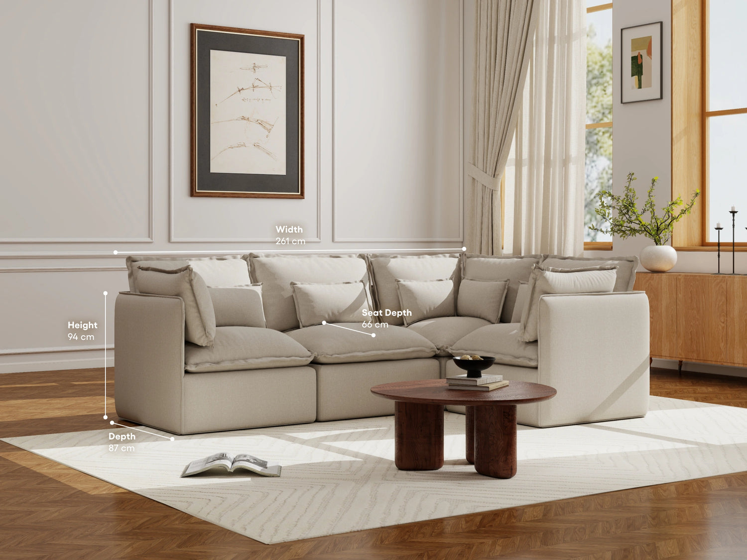 I originally got the 4 seater, I’ve since added two more seats and 2 ottomans. I have 2 toddlers and a dog (and a tradie) AND the white version and I am super impressed with the way it spot cleans. I’ve gotten pen, raspberry and chocolate off without having to wash it in the machine. The pillows get softer everytime we sit on it and it’s firm enough that it has decent support in the back. I hope they bring out more colours! Maybe boucle grey?? Or a chocolate! It has not disappointed me yet!