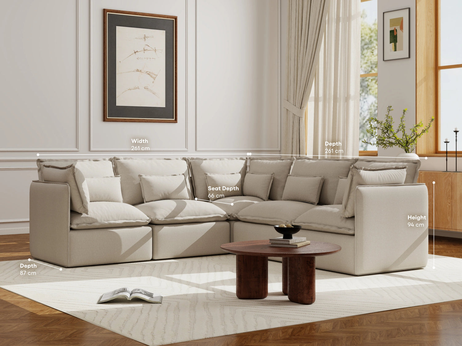 I originally got the 4 seater, I’ve since added two more seats and 2 ottomans. I have 2 toddlers and a dog (and a tradie) AND the white version and I am super impressed with the way it spot cleans. I’ve gotten pen, raspberry and chocolate off without having to wash it in the machine. The pillows get softer everytime we sit on it and it’s firm enough that it has decent support in the back. I hope they bring out more colours! Maybe boucle grey?? Or a chocolate! It has not disappointed me yet!