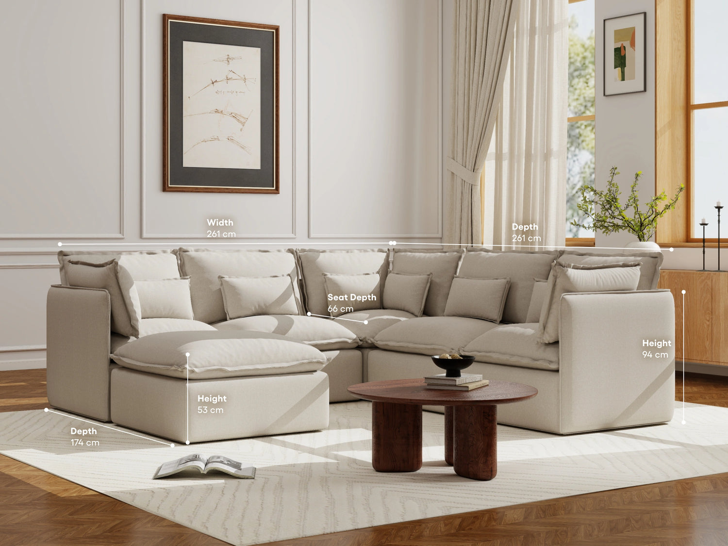 I originally got the 4 seater, I’ve since added two more seats and 2 ottomans. I have 2 toddlers and a dog (and a tradie) AND the white version and I am super impressed with the way it spot cleans. I’ve gotten pen, raspberry and chocolate off without having to wash it in the machine. The pillows get softer everytime we sit on it and it’s firm enough that it has decent support in the back. I hope they bring out more colours! Maybe boucle grey?? Or a chocolate! It has not disappointed me yet!