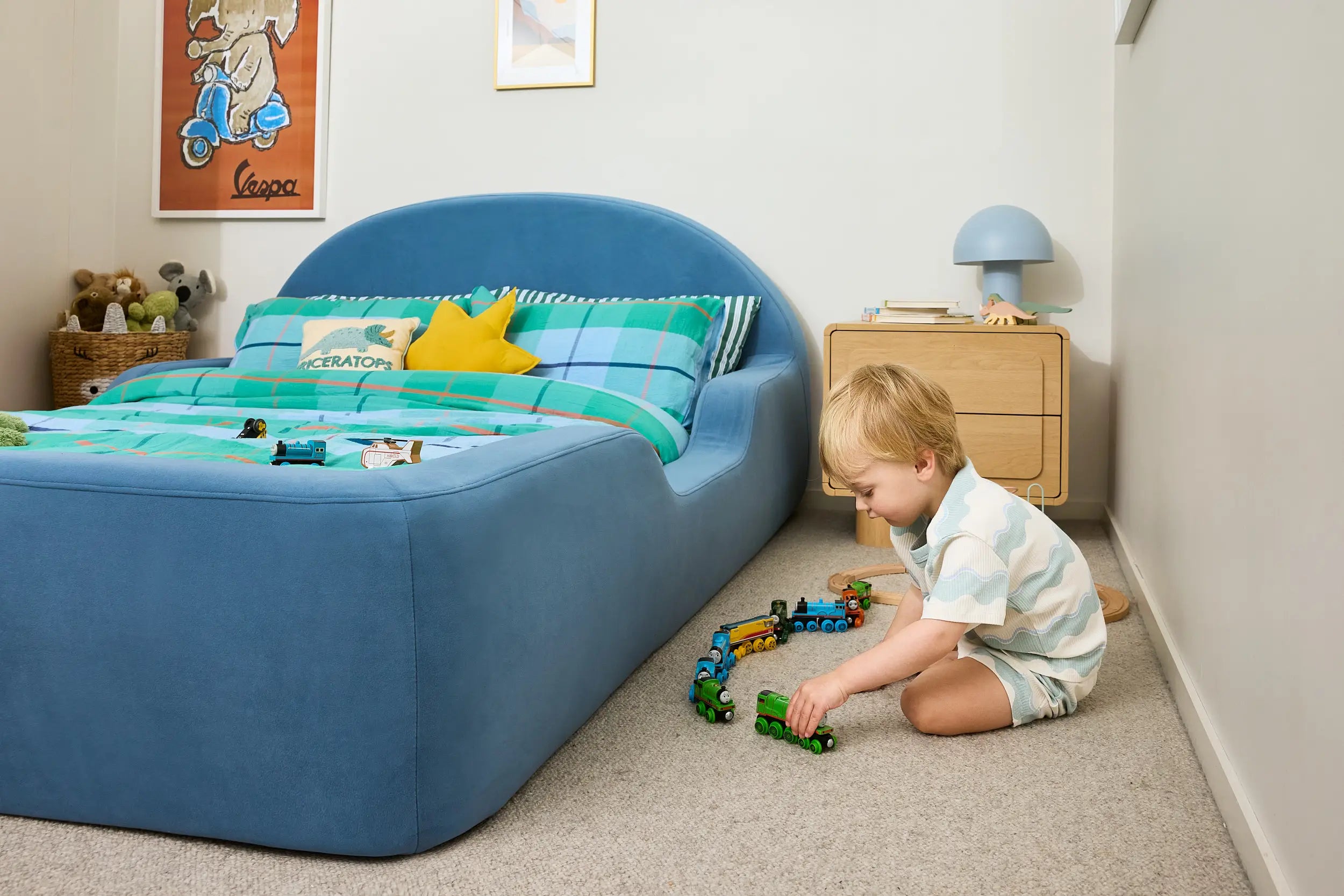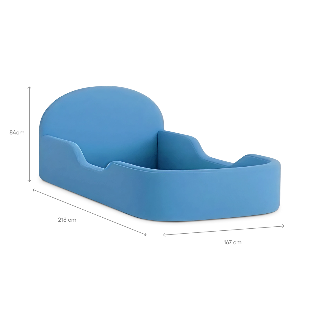 Built for Big Dreams & Little Accidents. Meet the bed that understands real life with real kids. Designed with soft, rounded edges and zero hard materials, the Little Lifely Double Bed (Dusty Blue) keeps bumps, bruises, and bedtime stress at bay. Its low-to-the-ground design makes it perfect for toddlers learning independence — without compromising on safety.