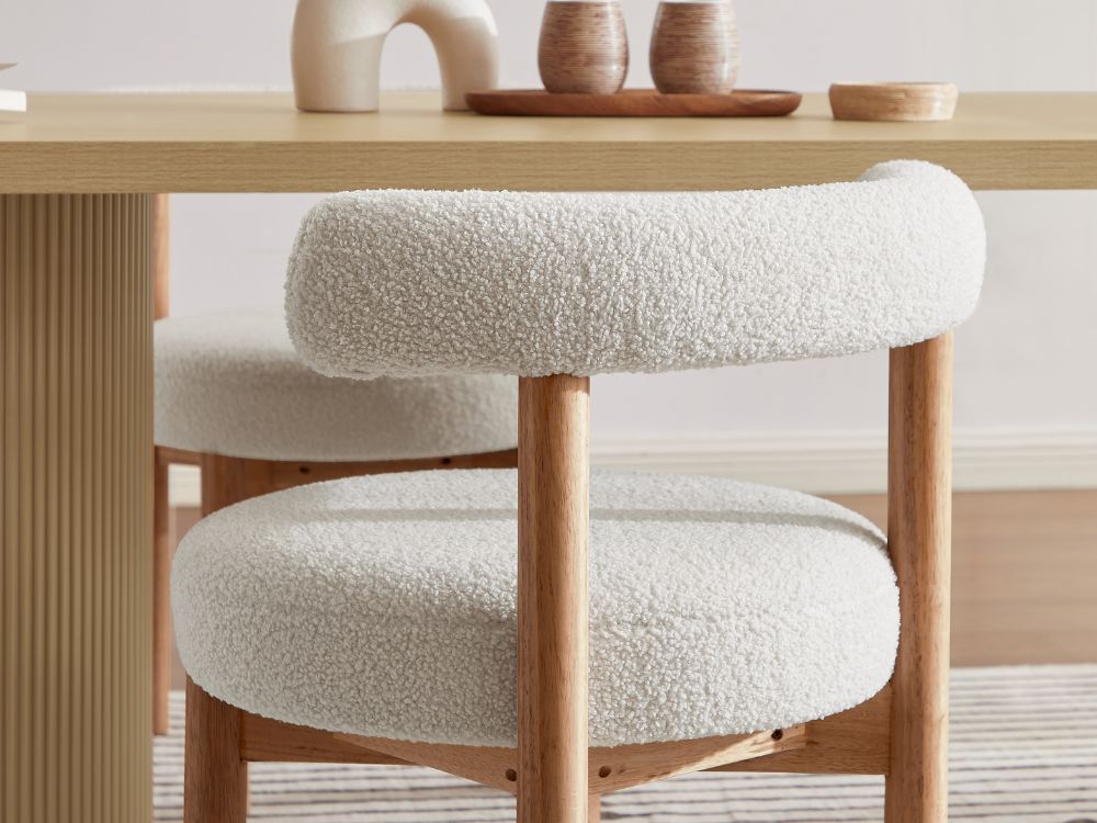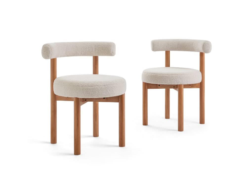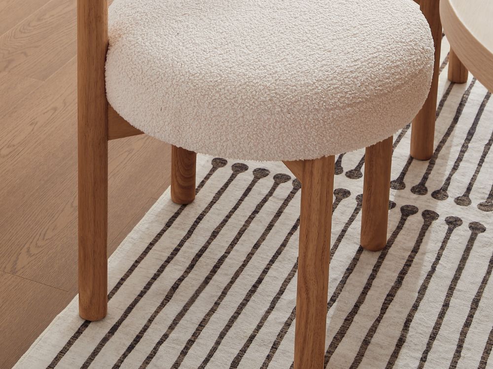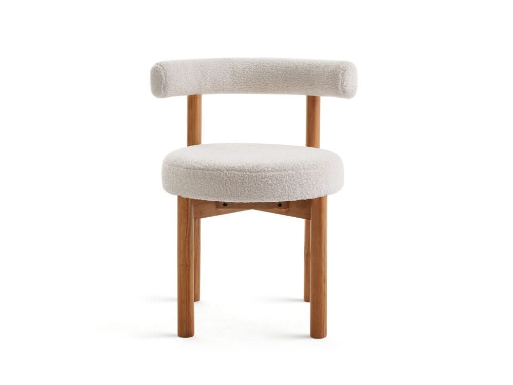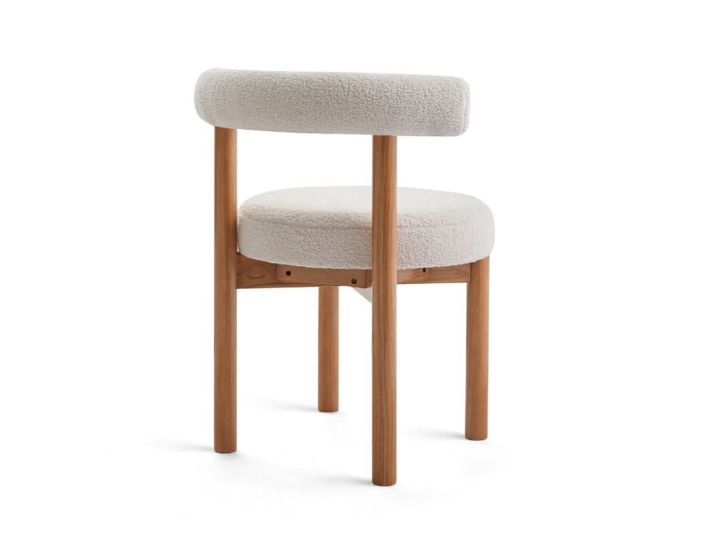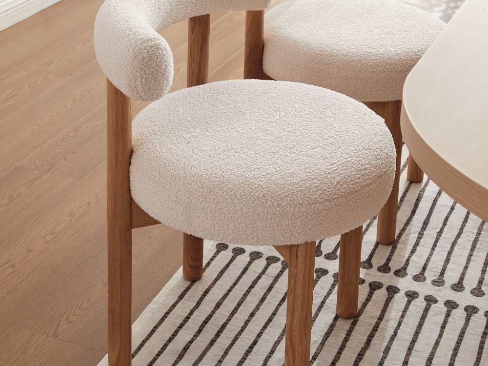 With its creamy fabric upholstery set against rich walnut-stained rubberwood legs, Noah celebrates the balance of soft and structured materials. The tonal contrast doesn’t just add visual intrigue—it enhances its ability to blend into both dark-toned and neutral dining settings.