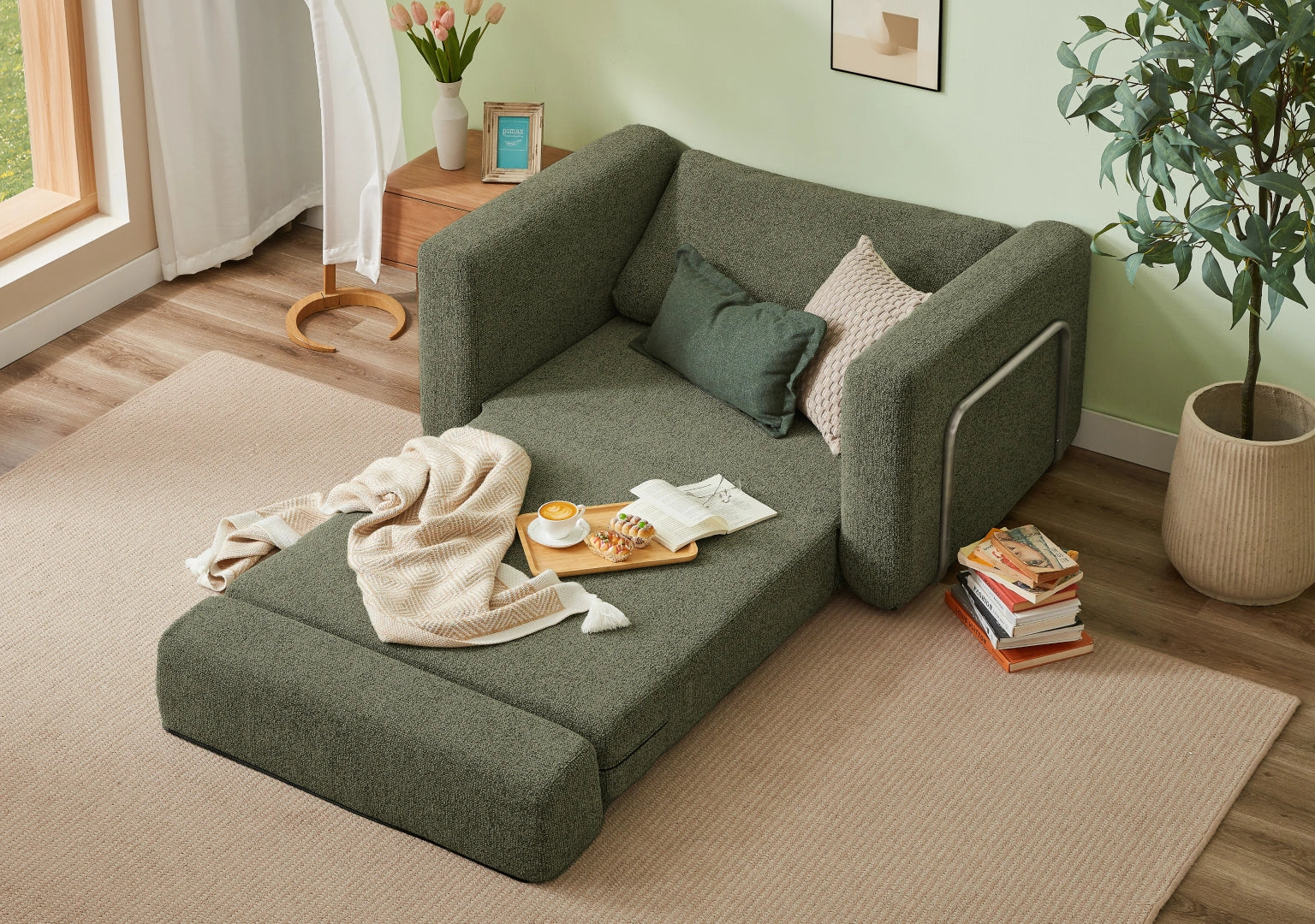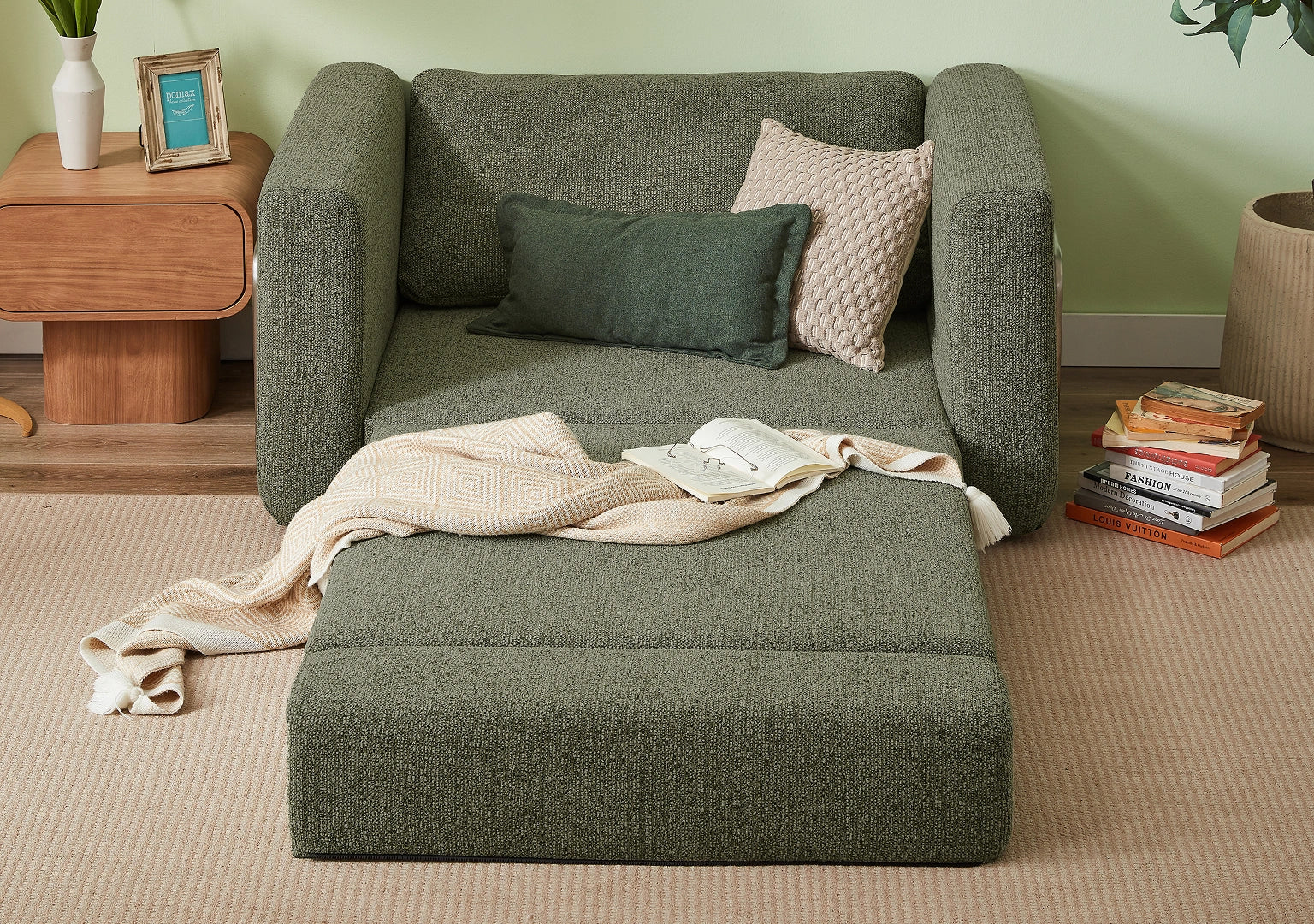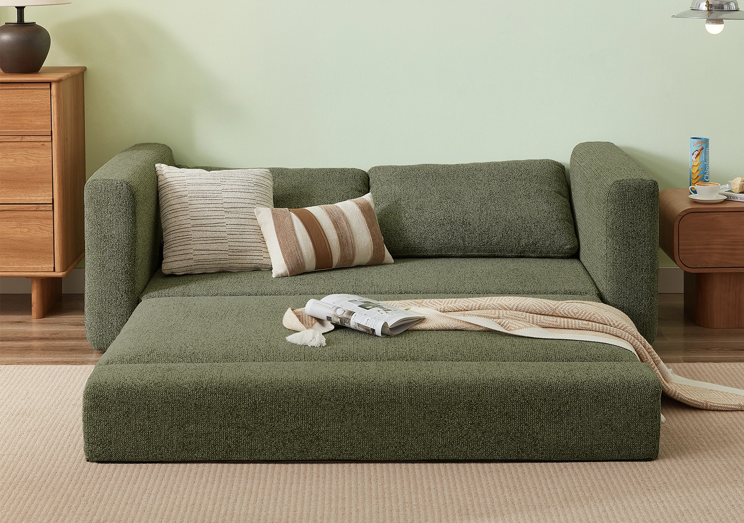 Now I’ve got this gorgeous, comfy sofa that actually turns into a bed in seconds (no squeaks, no struggle), and when guests aren’t over, it’s my little yoga sanctuary. I finally have room to stretch, move, and zen out — without sacrificing guest space.
